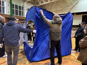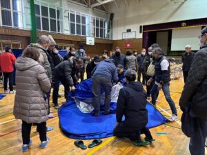 当日は雪が降っていて、会場の三内中学校体育館の入口にも雪が積もっていたが、あえて除雪をせず現実を体験してもらった。冬季間に避難所まで来る道路事情、歩道の確保など実践さながらの訓練となった。 ①簡易トイレの紹介 ②凝固剤の使い方を体験 ③簡易テントの組み立て、後始末の仕方(テントのたたみ方) ④アルファ米1人用の説明(種類が3種類に増えた)