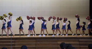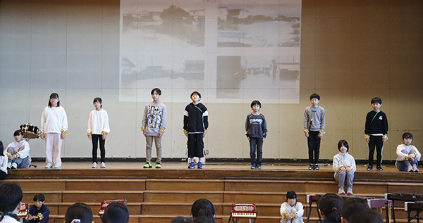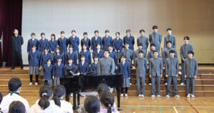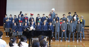 音楽部と特設合唱団による演奏と合唱を披露 女子3人の音楽部員ですが、エレキギターとドラムによる演奏は学校の音楽部という概念を覆し、のびのびとダイナミックな音を醸し出していました。 特設合唱団は、中学校最後の9学年の生徒たちが男女混合で息の合ったハーモニーを届けてくれました。女子の一線のような澄んだ声と男子の逞しく大きな歌声とパフォーマンスが印象に残っています。