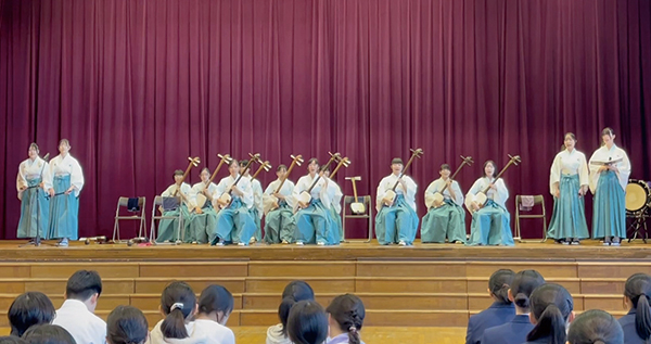 青森県高等学校総合文化祭 郷土芸能の部で最優秀賞を獲得し、全国大会にも何度か出場している同部を招き、郷土の伝統文化に触れるいい機会となりました。青森県の四季を風で表現した演奏は、会場全員の心を鷲掴みにし、皆さん微動だにせず魅了されていました。