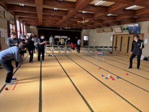 障がい者スポーツとしてオリンピックでも人気が高かった競技ですが、小学生から高齢者まで幅広く出来ることもあり、当初は小学生と高齢者の対抗試合を考えていましたが、急に選挙が行われることになり会場の都合等で高齢者だけの大会となりました。皆初めての挑戦でしたがとても上手く、講師の先生が提供してくれた景品をゲットするために元気に競っていました。