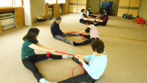 40代から最高年齢80歳の男女20名が、参加者に合わせた易しいプログラムで、「高校3年生」や「365歩のマーチ」等の懐かしい音楽に合わせ、和気藹々と楽しく汗を流しています。